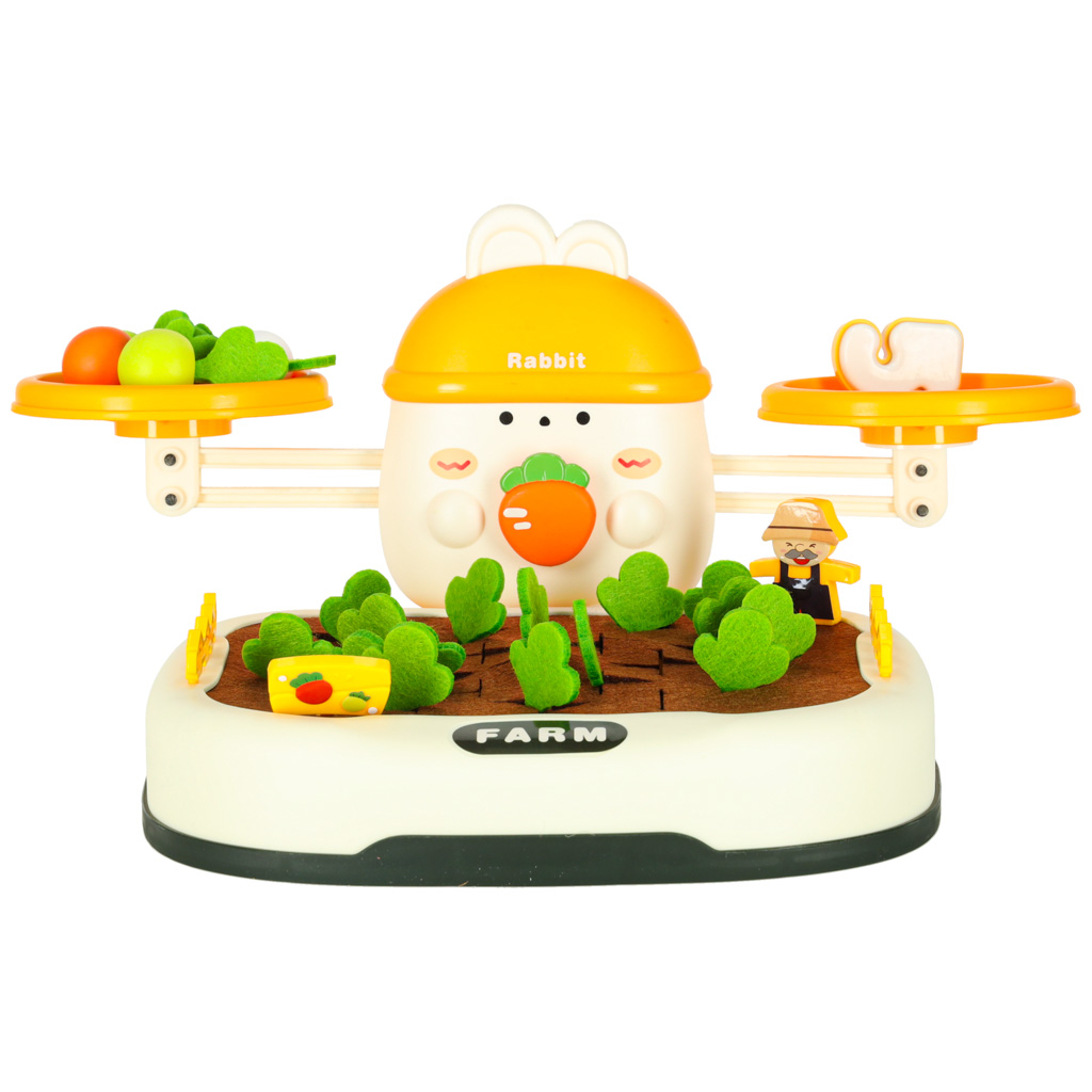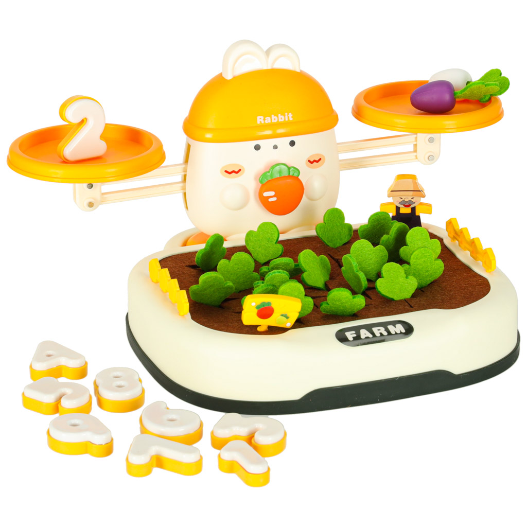 Na górze zestawu króluje uroczy królik, który "pilnuje" równowagi. Dziecko może układać marchewki lub inne elementy, starając się zachować równowagę albo świadomie ją zakłócać, ucząc się przy tym podstaw fizyki i logicznego myślenia. Do zestawu dołączone są również specjalne cyferki - każda z nich ma odpowiednio dobraną wagę, odpowiadającą reprezentowanej liczbie. Dzięki temu maluch może eksperymentować, porównując ciężar i ucząc się wartości liczbowych w praktyce! Zabawa ta świetnie wspiera naukę liczenia i podstawowych pojęć matematycznych.