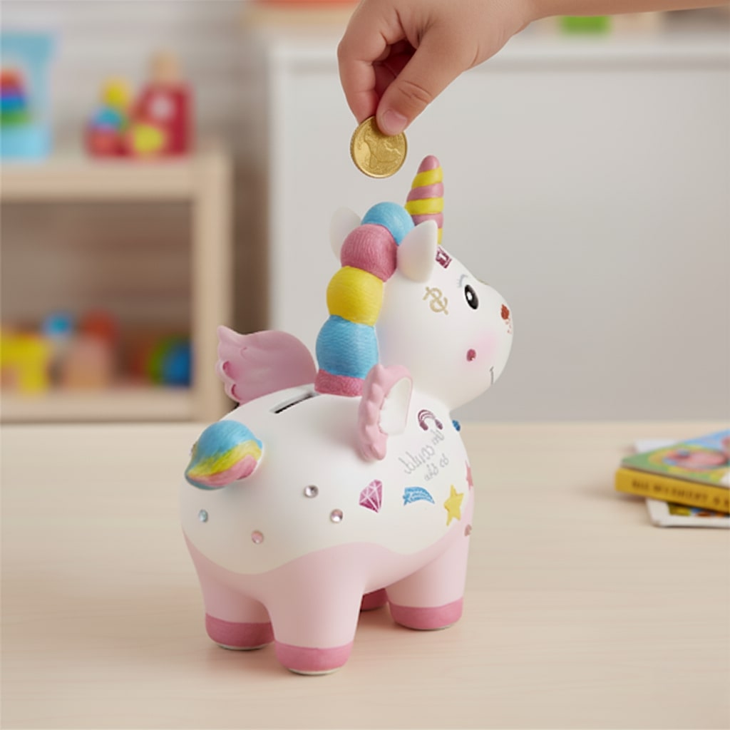 ✅ Nawyk oszczędzania – skarbonka zachęca do zbierania pierwszych oszczędności.