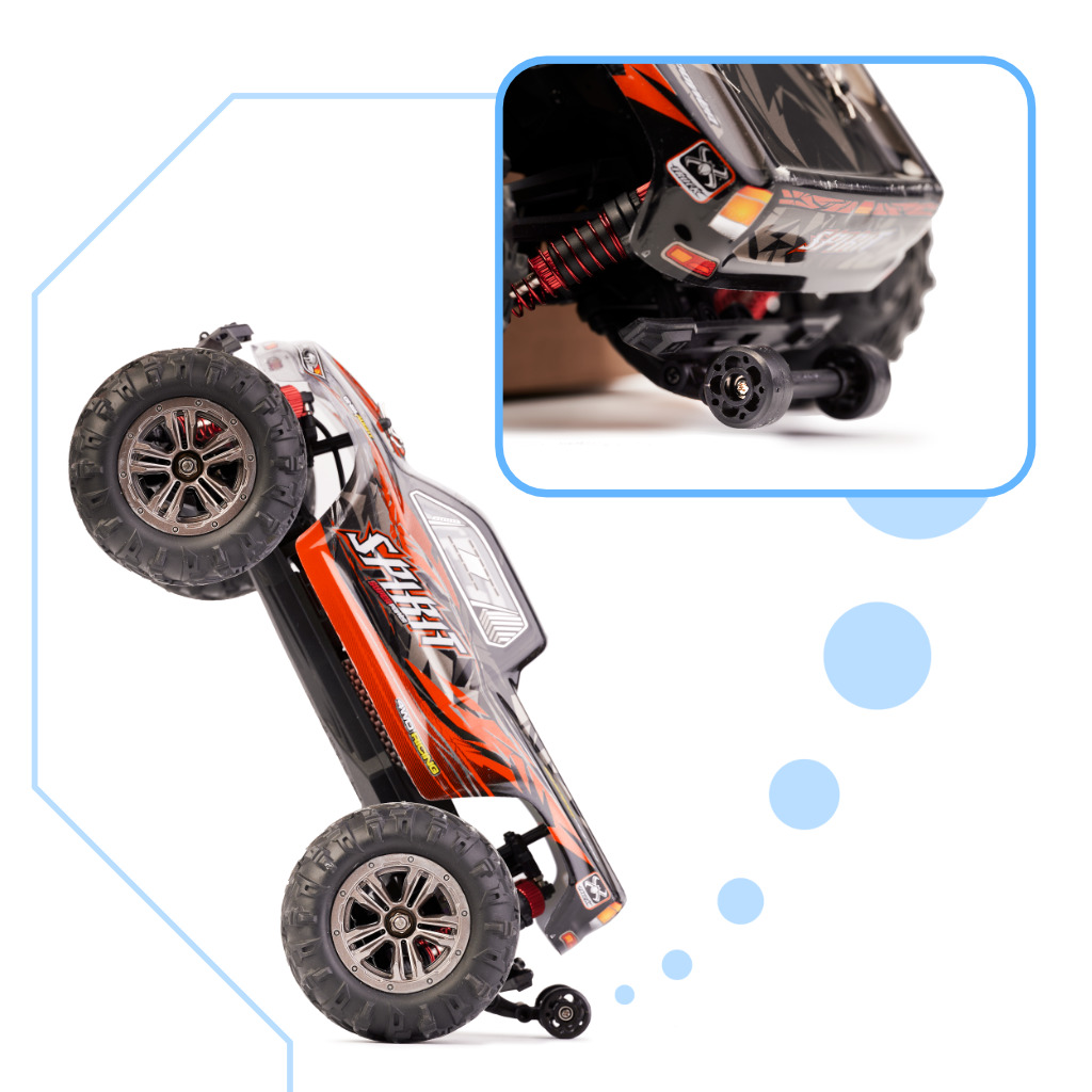 Duże koła, agresywne nadwozie to cechy, które przyciągną uwagę każdego! A to dopiero początek rozrywki – im dalej, tym lepiej! Niewątpliwą zaletą model są porządne opony AT, które pozwolą osiągać zawrotne prędkości na każdym podłożu.